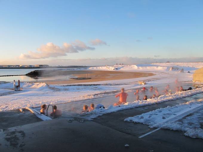 Der Nauthólsvík Geothermal Beach befindet sich in Reykjavik, der Hauptstadt Islands. Es handelt sich um eine vollständig künstliche Attraktion, die aus künstlichen Strukturen, einem künstlichen Strand und geothermischen Einrichtungen besteht. Er ist nur wenige Kilometer vom Stadtzentrum entfernt und somit ein perfekter Ort für einen Besuch. Im Gegensatz zu Islands natürlichen schwarzen Sandstränden ist der Sand am Nauthólsvík Beach weiß, und der Strand ist von üppigem Gras und malerischen Schwimmbecken umgeben. Das warme Wasser hier wird durch geothermische Heizungsrohre erwärmt, sodass Besucher zu jeder Jahreszeit im Freien schwimmen und den Sommerspaß am Strand genießen können.