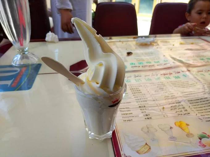 Il gelato nello Xinjiang è diviso in stili meridionali e settentrionali. Il gelato del sud dello Xinjiang è fatto solo con latte e zucchero, risultando in un sapore di latte molto ricco. A Yining, vengono aggiunte anche le uova, conferendo un colore giallastro e un sapore più dolce. Questo gelato di Kashgar è un tipico sapore del sud dello Xinjiang ed è abbastanza buono.