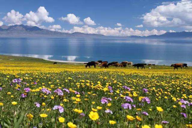 雪山を背にしたサイリム湖、湖畔には広大な草原が広がり、湖水は澄んで青く、その絶妙な景色から新疆の名勝の一つとなっています。毎年6月と7月には、湖畔の草原に様々な野花が咲き乱れ、見逃せない美景が広がります。毎年6月頃がサイリム湖の最も良い観光シーズンで、この時期には湖周辺の緑草が茂り、野花が咲き誇り、雪山の下の青い湖水と相まって、最も美しい景色が広がります。湖を一周して写真を撮るのも素晴らしいです。